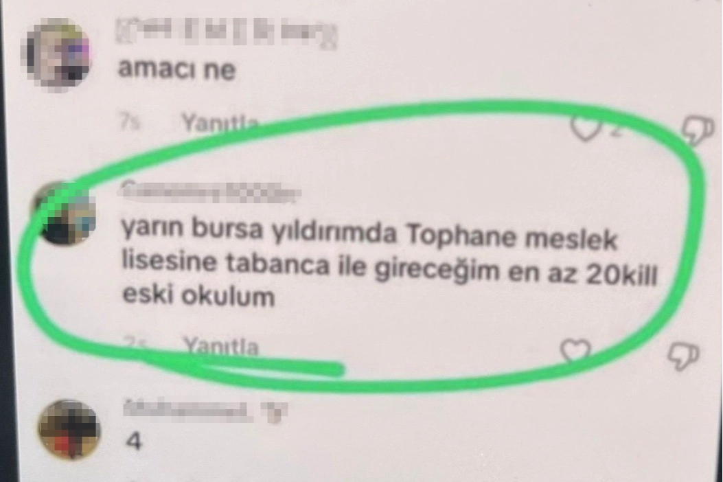 Öte yandan, Şanlıurfa ve Kahramanmaraş’ta yaşanan okul saldırılarının ardından bir paylaşımın altına "sıra bende" şeklinde yorum yapan bir başka kişinin de Bursa’da yaşadığı tespit edildi. Kimliği belirlenen Y.İ. (19), polis ekiplerince düzenlenen operasyonla yakalanarak gözaltına alındı.