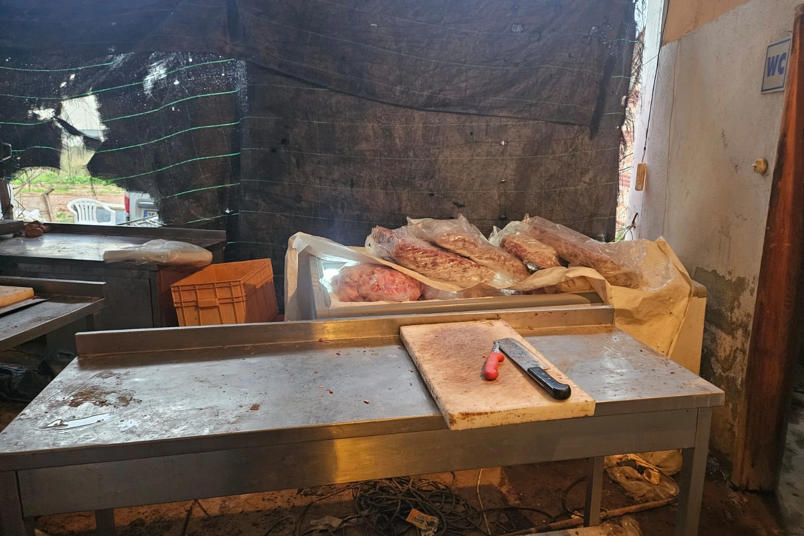 Ekiplerin adeta mezbahaya dönüştürülen otoparkta yaptığı incelemelerde, bidon ve kovalar içinde 1,5 ton et bulundu.