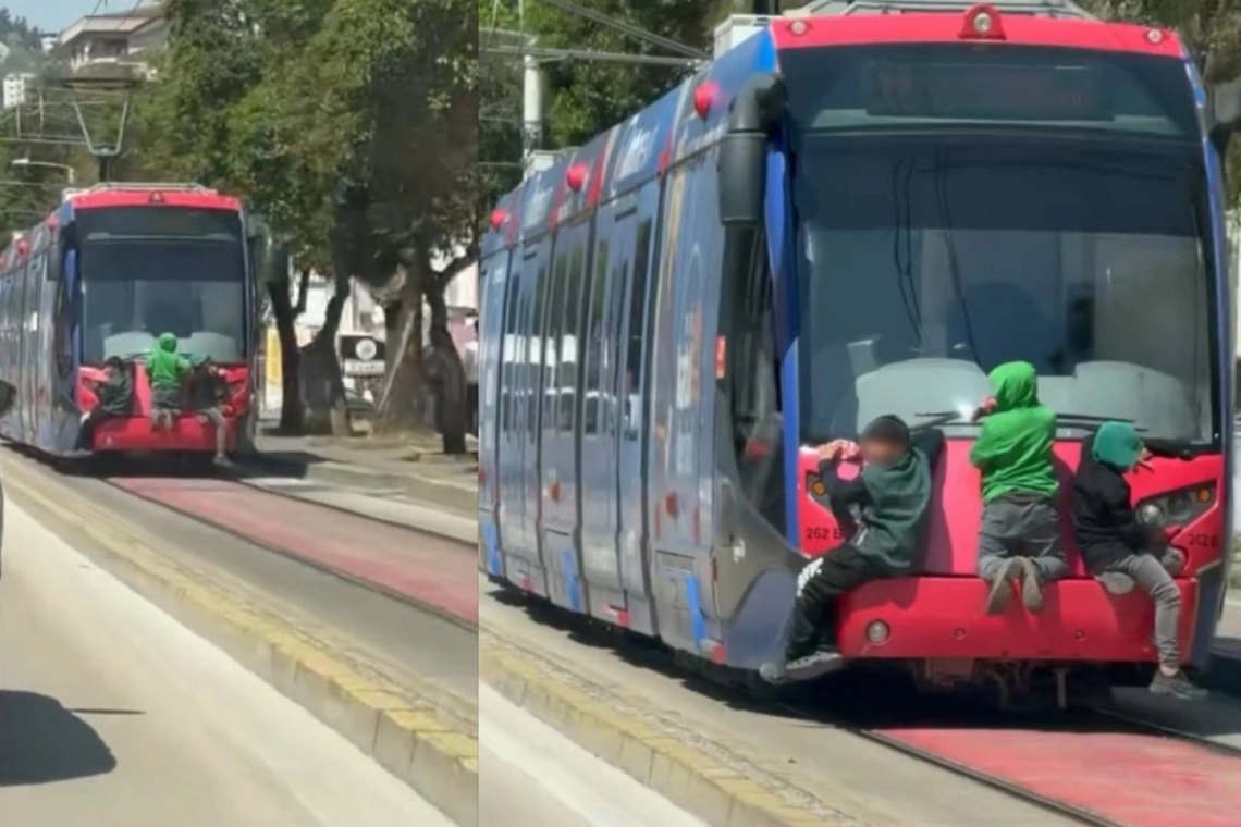 Bursa'nın Osmangazi ilçesi Çekirge Mahallesi Darmstadt Caddesi üzerinde seyreden tramvayın arkasına tutunan 3 çocuk, hem kendi canlarını hem de trafikteki diğer sürücüleri tehlikeye attı.