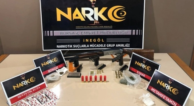 Operasyonda 18 gram sentetik kannobinoid, 37 gram metamfetamin, 22 gram esrar, 115 sentetik hap, uyuşturucu madde ticaretinden elde edildiği değerlendirilen 5 bin 400 lira, 1 ruhsatsız av tüfeği, 2 ruhsatız tabanca, 1 ruhsatsız kuru sıkı tabanca, 34 tabanca fişeği, 6 av tüfeği fişeği ve 30 kuru sıkı tabanca fişeği ele geçirildi.