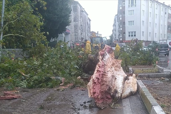 Yağış ve kuvvetli rüzgar nedeniyle bazı ağaçlar ve dükkanların masa sandalye ve tenteleri devrildi.