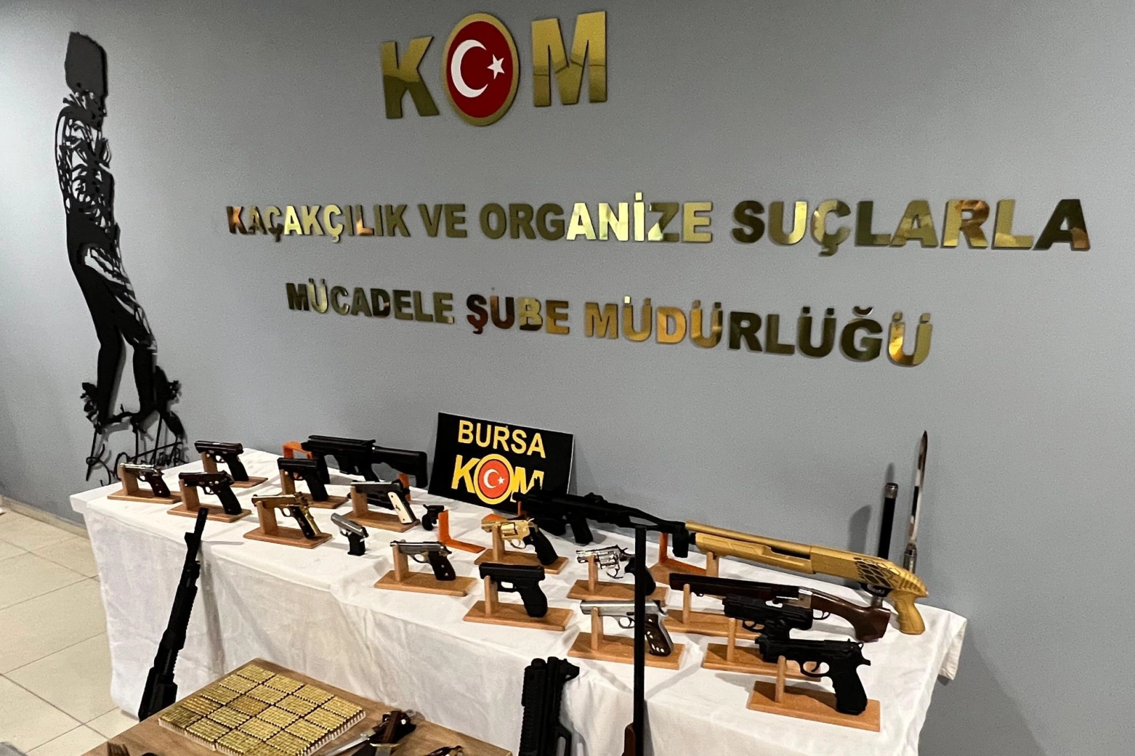 Bursa Emniyet Müdürlüğü Kaçakçılık ve Organize Suçlarla Mücadele Şube Müdürlüğü ekipleri, "ruhsatsız silah imal ve ticareti" suçunun önlenmesine yönelik yürüttükleri soruşturma kapsamında takip ettikleri şüpheliler S.A. ve M.E.B'nin Nilüfer ilçesindeki ev ve iş yerlerine eş zamanlı baskın yaptı. Yapılan aramalarda 10 ruhsatsız tabanca, tam otomatik silah, kesme tüfek, bin 347 adet tabanca fişeği, 4 ruhsatsız tüfek, 6 kurusıkı tabanca, dürbün ve 7 bıçak ele geçirildi.