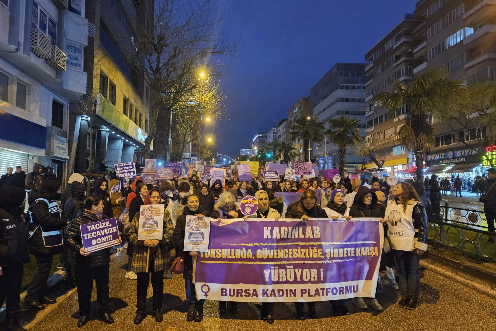 Bursa Kadın Platformu'nun çağrısıyla kadınlar, yağmura rağmen Fomara Meydanı'nda 18.30'da bir araya geldi. Yürüyüşe başlamadan önce kadınlar, halay çekti. "Yaşasın kadın dayanışması", "İnadına isyan, inadına özgürlük", "Susmuyoruz, korkmuyoruz, itaat etmiyoruz" sloganları atıldı. Erkek devlet şiddetine karşı bir araya geldiklerini söyleyen kadınlar, "Kadın, Yaşam, Özgürlük" diye seslendi.
