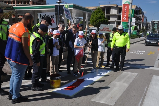 Etkinlikte, kavşak giriş ve çıkışlarıyla yaya ve okul geçitlerine yaklaşırken yavaşlamak, yayalara durarak ilk geçiş hakkını vermeye dikkati çekmek ve farkındalık oluşturmak amacıyla yaya şeritleri kırmızıya boyandı.