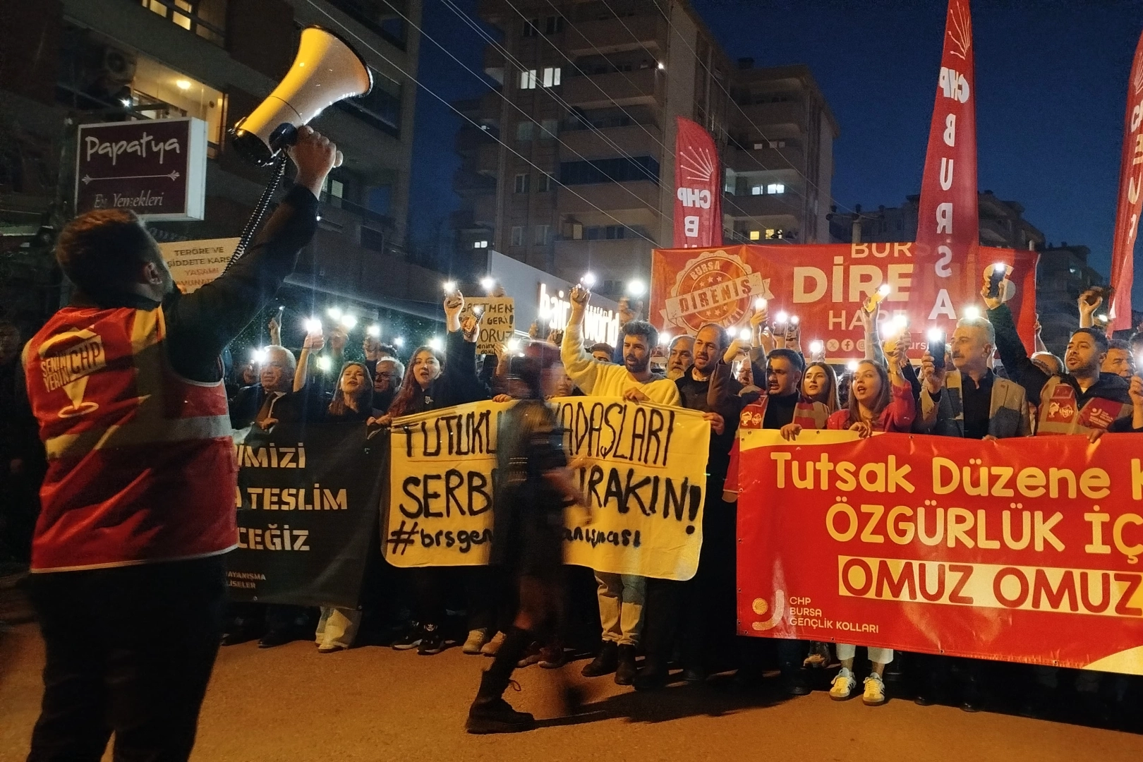 Cumhuriyet Halk Partisi (CHP) Bursa Gençlik Kolları, Ekrem imamoğlu'nun cezaevine gönderilmesinin ardından gerçekleştirilen gösterilerde yaşanan tutuklamalara tepki göstermek için yürüyüş gerçekleştirdi. Nilüfer Halk evinden başlayan yürüyüş 3 Fidan Parkı'nda son buldu.