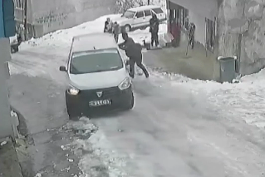 Görüntüde, aracın yokuş çıkarken geriye kaymaya başlaması ve bir vatandaşın kayan aracı tutmaya çalışması görülüyor.