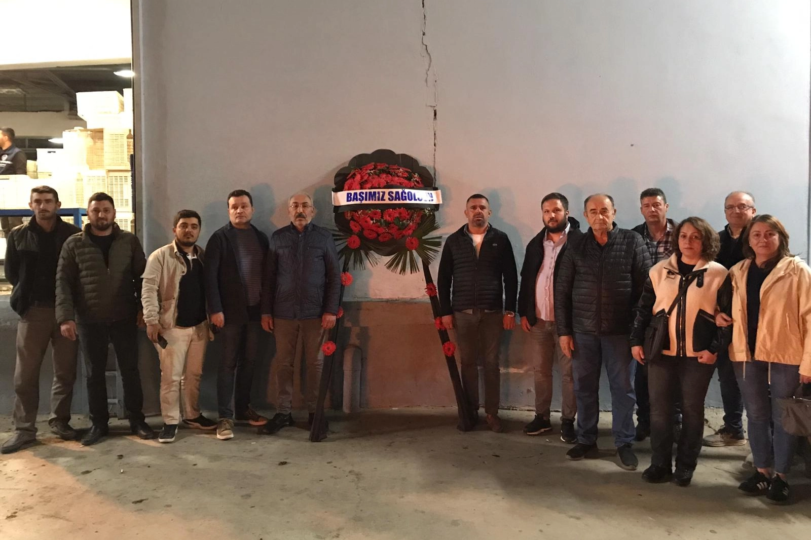 Bursa’da CHP İznik İlçe Başkanı Sadullah Eşiyok ve yönetim kurulu üyeleri, traktörle Marmarabirlik İznik Zeytin Tarım Satış Kooperatifine gitti. Eşiyok ve beraberindeki partililer, açıklanan düşük zeytin barem fiyatlarını protesto etmek için kooperatif önüne ‘Başımız sağolsun’ yazılı siyah çelenk bıraktı.