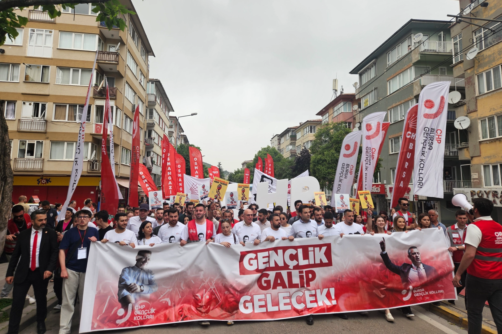 Cumhuriyet Halk Partisi Bursa Gençlik Kolları, Genel Başkan Özgür Özel'in katılımıyla gerçekleşecek "Millet iradesine sahip çıkıyor" mitinginden önce yürüyüş düzenledi.