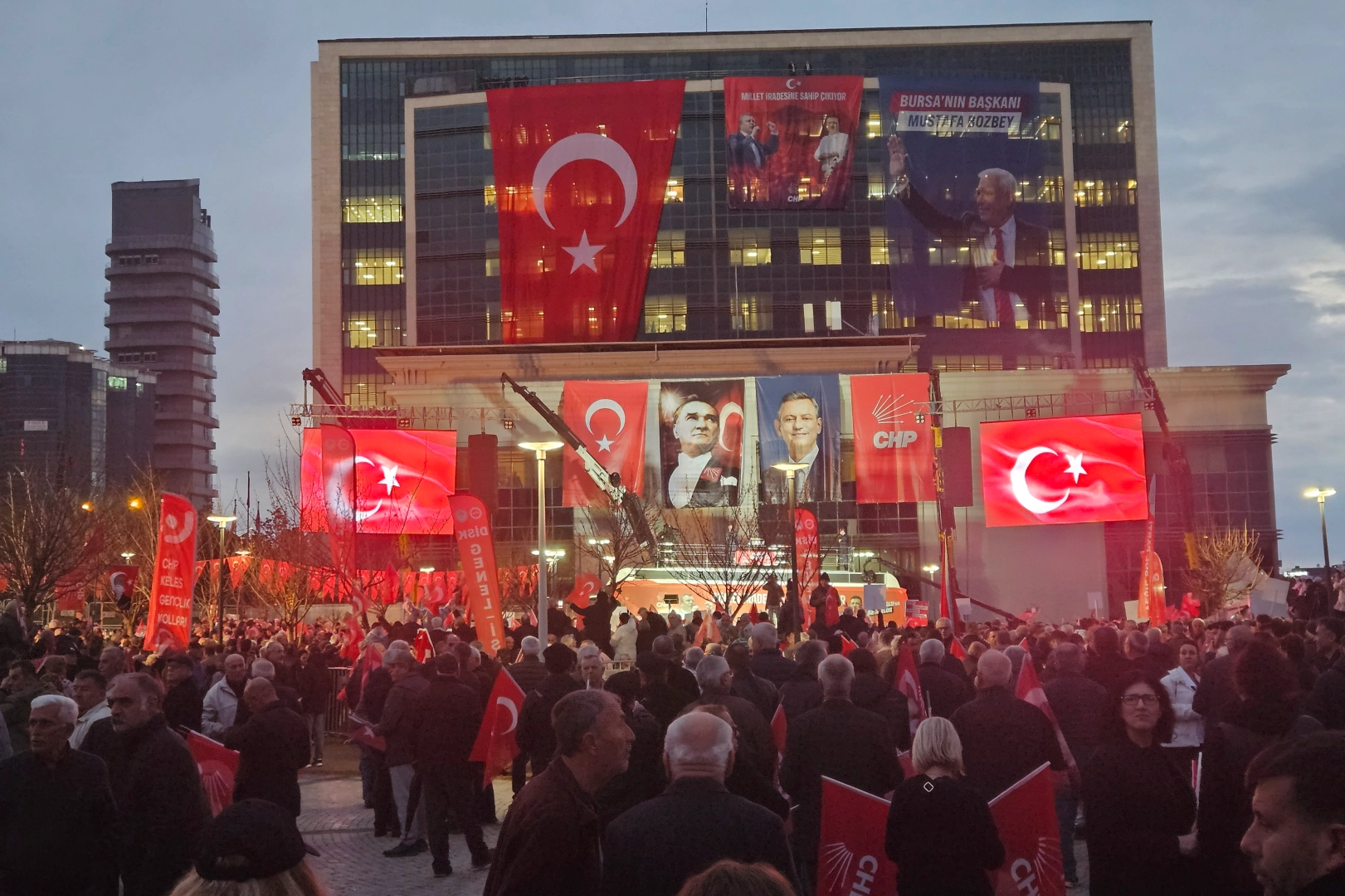 Bursa Büyükşehir Belediye Başkanı Mustafa Bozbey'in eşi, kızı, bazı aile bireyleri ve çok sayıda iş insanı ile birlikte "rüşvet ve yolsuzluk" suçlamasıyla gözaltına alınmasının ardından Ankara Yolu'ndaki Büyükşehir Belediyesi önünde başlayan protesto ve Bozbey'e destek gösterileri sürüyor. CHP lideri Özgür Özel'in katıldığı mitingde ilçe örgütleri, CHP'li ilçe belediye başkanları ve çok sayıda vatandaş yer alıyor.