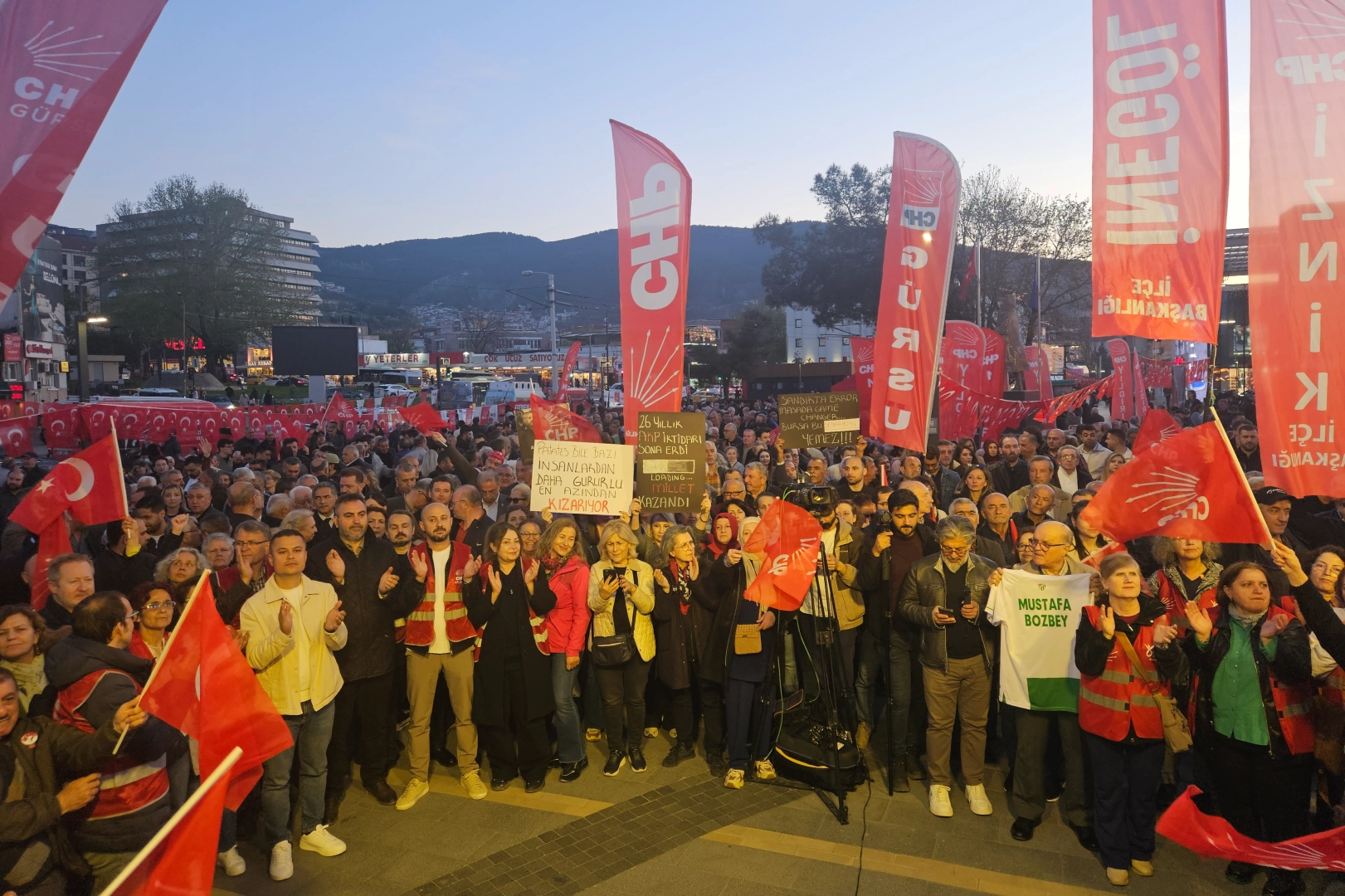 Bursa Büyükşehir Belediye Başkanı Mustafa Bozbey'in tutuklanarak görevinden el çektirilmesinin ardından CHP Bursa İl Örgütü öncülüğünde CHP'liler her hafta bir araya geliyor. Geçen hafta Pazar günü Nilüfer Hastane Alanı'nda yapılan mitingin ardından bu hafta Kent Meydanı’nda buluşuldu.