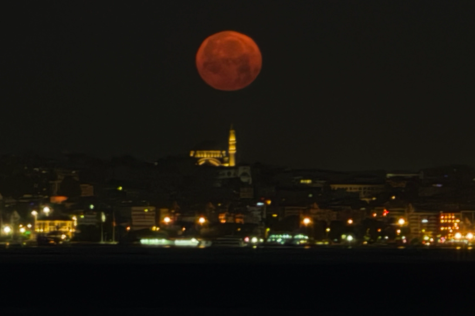 Atmosferdeki nem ve ince toz tabakalarının etkisiyle kehribar ve pembe tonlarında bir ışık yayan dolunay, adeta yazın gelişini müjdeleyen bir görünüme sahip oldu.