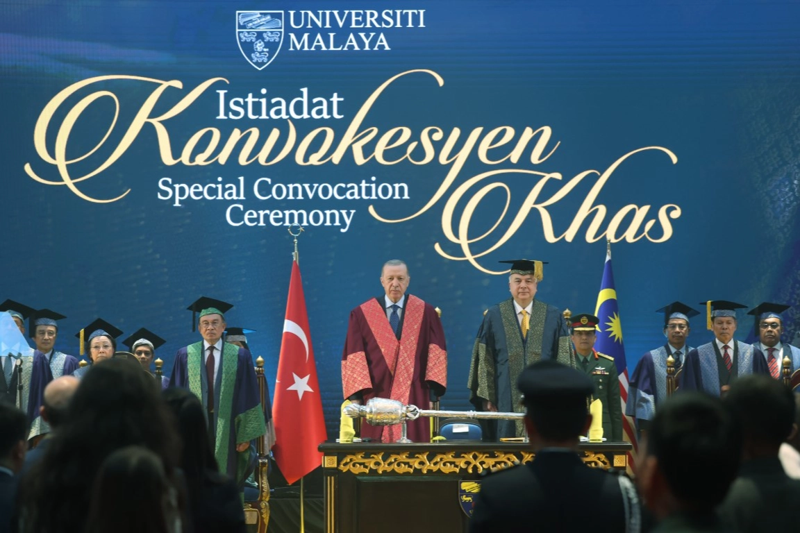 Cumhurbaşkanı Recep Tayyip Erdoğan, resmi ziyaret düzenlediği Malezya'da temaslarını sürdürüyor. Erdoğan, uluslararası ilişkiler alanında tevdi edilen ve Perak Sultanı Nazrin Şah tarafından sunulan fahri doktora beratı dolayısıyla düzenlenen törene katıldı. Cumhurbaşkanı Erdoğan'a Malezya'da Perak Sultanı Nazrin Şah tarafından fahri doktora beratı tevdi edildi. Cumhurbaşkanı Erdoğan burada gerçekleştirdiği konuşmasında, "Beş yıl aradan sonra dost ve kardeş Malezya'da tekrar bulunmaktan duyduğum memnuniyeti ifade ederek sözlerime başlamak istiyorum. Başbakan Enver İbrahim'in davetine icabetle ziyaret ettiğim Güzel ülkenize her gelişimizde kendimizi evimizde kardeşler arasında hissediyoruz. Rabbim aramızdaki dayanışma ve muhabbeti daim eylesin diyorum. Asya'nın iki yakasında yer alan Türkiye ve Malezya coğrafi uzaklığa rağmen esasen birbirlerinin dost, kardeş ve aynı zamanda ortağıdır. Bu ortaklığı 2014 yılında stratejik, 2022 yılında ise kapsamlı stratejik düzeye çıkardık. Ülkelerimiz arasındaki iş birliğinin önemli boyutlarından birini eğitim ve beşeri ilişkiler oluşturuyor" dedi.