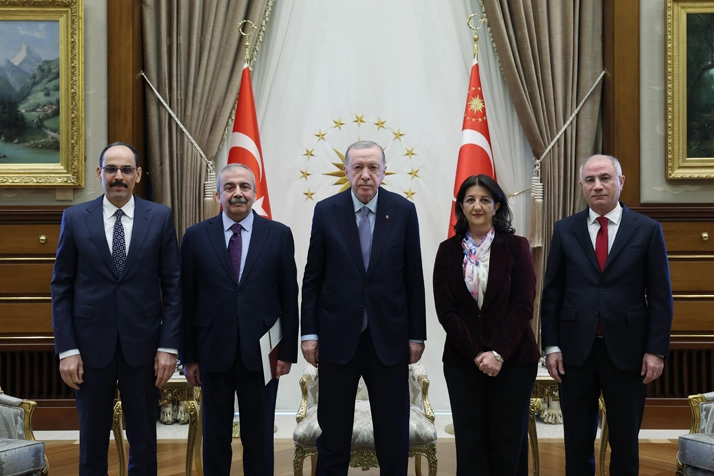 DEM Parti İmralı Heyeti'nin Cumhurbaşkanı Tayyip Erdoğan ile görüşmesi sona erdi. Erdoğan’ın Kürt siyasetçilerle 13 yıl sonraki ilk teması olma niteliği taşıyan görüşmeye DEM Parti'den Sırrı Süreyya Önder ve Pervin Buldan katıldı. 1,5 saat süren görüşmede AKP Genel Başkanvekili Efkan Âlâ ile MİT Başkanı İbrahim Kalın da yer aldı.