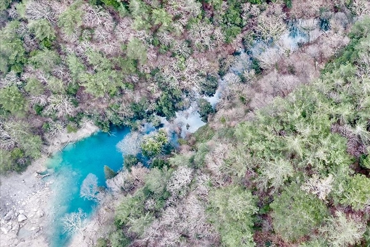 Depremlerin meydana geldiği 6 Şubat'tan bu yana biriken su, burada ağaçların arasında turkuaz mavisi bir gölete dönüştü.