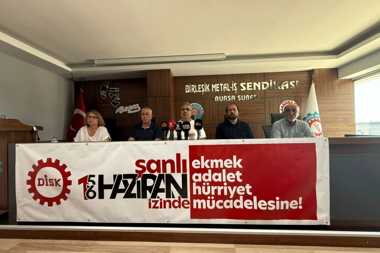 DİSK Güney Marmara Bölge Temsilcisi Birleşil Metal-İş Sendikası Bursa Şube Başkanı Gökhan Aydın, “Bugün, tarihimizin en büyük direnişlerinden biri olan 15-16 Haziran 1970 Büyük İşçi Direnişi’nin 55. yılındayız. Ama bu yıldönümünü sadece bir anma olarak görmüyoruz. Bugün burada toplanmamızın sebebi sadece geçmişi hatırlamak değil; aynı zamanda bugünü anlamak, geleceği örgütlemektir. Çünkü koşullar, tehdit, çözüm de çok tanıdık. Bugün de soframızdaki ekmek küçülüyor, haklarımız elimizden alınıyor, grev hakkımıza, sendikal haklarımıza, hatta seçme ve seçilme hakkımıza göz dikiliyor. Bugün de emeğimizin karşılığı çalınıyor, ücretlerimiz pula dönüyor, hayat pahalılığı karşısında alın terimiz hiçe sayılıyor. Bizden her gün biraz daha sessizlik isteniyor. İtaat isteniyor. Ama biz DİSK’liyiz. Biz susmayız, boyun eğmeyiz. Tıpkı 55 yıl önceki gibi” dedi.