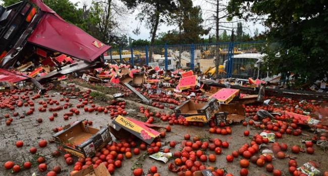 Çarpmanın etkisiyle kontrolden çıkan kamyon, trafik ikaz lambalarına da çarptıktan sonra devrildi. Yaklaşık 30 metre sürüklenen kamyonun kasasındaki domatesler çevreye saçıldı.