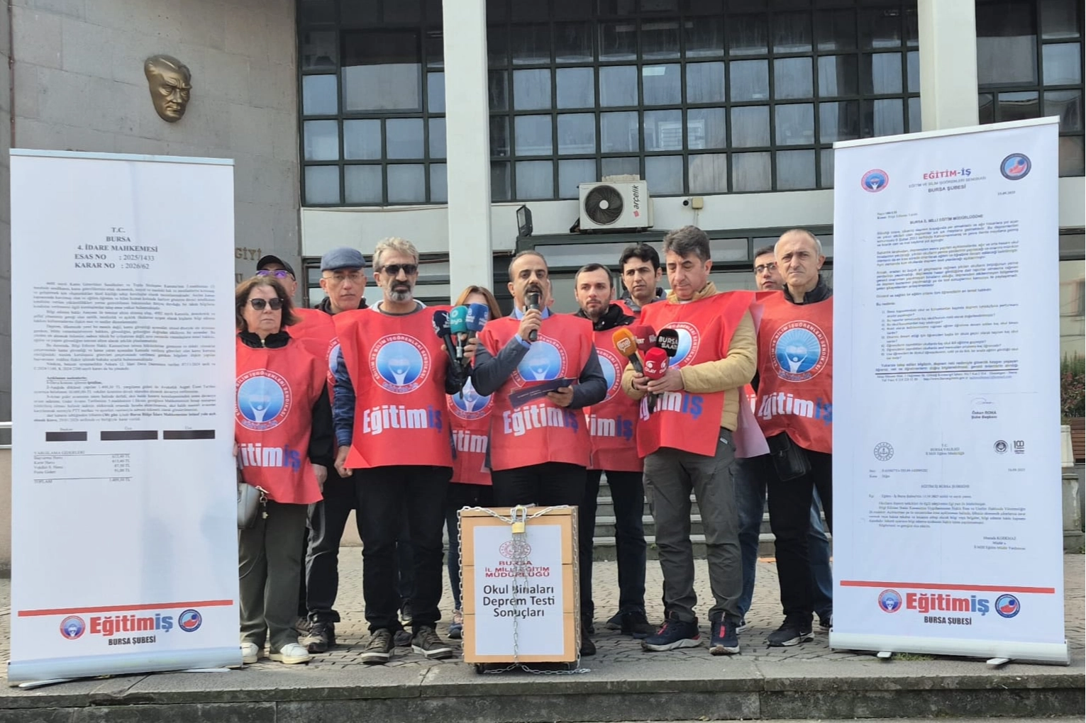 Eğitim-İş Bursa Şubesi, Bursa’daki okulların deprem dayanıklılık durumuna ilişkin bilgilerin kamuoyuna açıklanması talebiyle Bursa İl Milli Eğitim Müdürlüğü önünde basın açıklaması yaptı. Şube Başkanı Özkan Rona, bilgi edinme başvurularına “ticari sır” gerekçesiyle yanıt verilmediğini belirterek konuyu yargıya taşıdıklarını ve davayı kazandıklarını açıkladı. Rona, mahkeme kararının uygulanarak deprem dayanıklılık raporlarının açıklanması için müdürlüğe 24 Mart’a kadar süre verdiklerini söyledi. Ayrıca Yiğitler İmam Hatip Ortaokulu’nda bir tarikat şeyhine ait kitapların öğrencilere dağıtıldığı iddialarına da değinen Rona, okul yönetimi ve ilgili vakıf hakkında suç duyurusunda bulunacaklarını duyurdu.