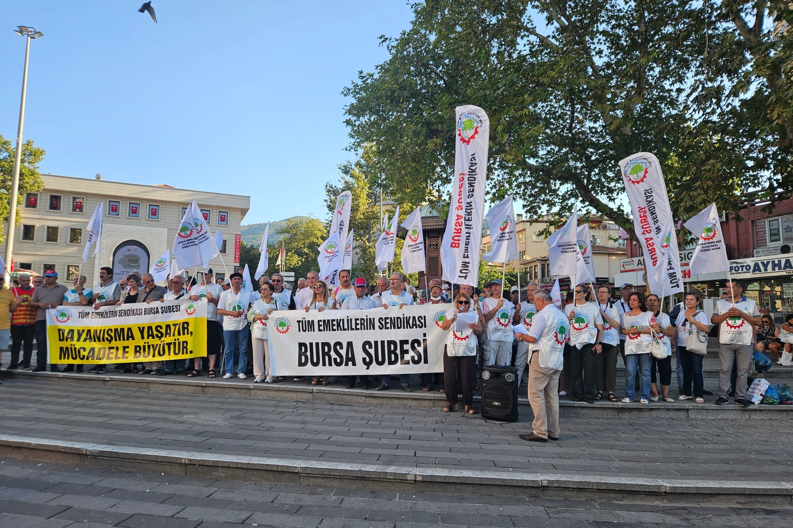 Tüm Emeklilerin Sendikası Bursa Şubesi, ekonomik kriz ve siyasal gelişmelerin emekliler üzerindeki etkilerini protesto etmek amacıyla Fomara (Şehreküstü) Meydanı’nda basın açıklaması yaptı. Açıklamayı Bursa Şube Başkanı Gülçin Ayyılmaz okudu.