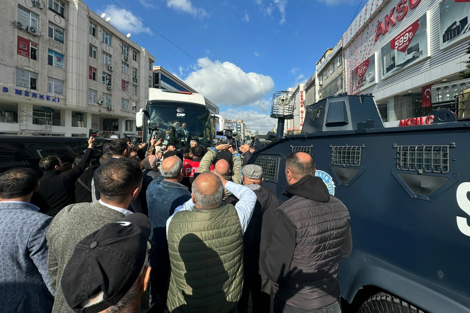 Son yerel seçimde yaklaşık 228 bin Esenyurtlu seçmenin oyunu alarak başkan seçilen Prof. Dr. Ahmet Özer'in tutuklanması, ardından da Can Aksoy'un kayyum olarak atanmasına karşı tepkiler devam ediyor. Saat 16.00'da yapılması planlanın protesto için CHP otobüsü 12.00 sıralarında Esenyurt Meydanı'na sokulmak istendi. Ancak polis araçları önüne çekilerek meydana girişi engelenmeye çalışıldı. O anlarda yurttaşlar "Hak, Hukuk, Adalet" sloganları atarak engellemeye karşı çıktı. Bölgede, polis ablukası altında bekleyiş sürüyor.