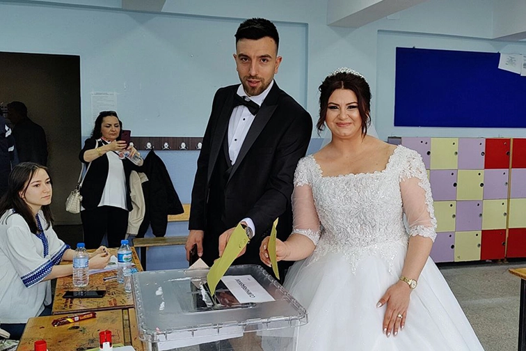 Damat ve gelin, kayıtlı oldukları sandıkta oylarını kullandı.