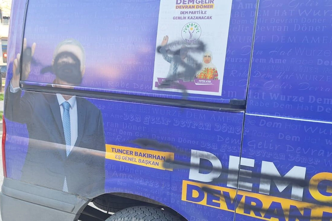 Bursa'nın Gemlik ilçesinde Halkların Eşitlik ve Demokrasi Partisi’nin (DEM Parti) seçim minibüsü ve ilçe binası, kimliği belirsiz kişi veya kişiler tarafından sprey boya ile karalandı. DEM Parti, bugün yerel seçim çalışmaları kapsamında Gemlik'te Perşembe Pazarı Alanı'nda halkla buluşma gerçekleştiriyor. Miting öncesi seçim otobüsü ve partinin ilçe binasına sprey boyalarla yazılama yapıldı. Araç üzerine ve parti binasının duvarlarına hakaret içerikli yazılar yazıldı. DEM Parti Eş Genel Başkanları Tülay Hatimoğulları Oruç ve Tuncer Bakırhan'ın fotoğrafları da karalanarak hedef alındı. Parti İl Sözcüsü Figen Ovat, suç duyurusunda bulunulacaklarını söyledi. Daha öncesinde İnegöl ilçe binasına yapılan saldırıyı hatırlatan Ovat, "Ne yazık ki fail göz altından serbest bırakıldı. Bu saldırıları gerçekleştirenlerin arkasında ki ırkçı ve faşist odakların olduğu kuşkusuz. Partimize yönelik ırkçı saldırıların devamlılığı cezasızlık politikalarının neticesidir" dedi.