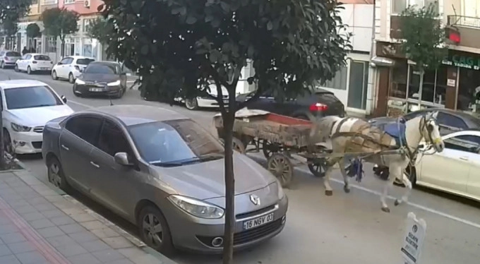 Sahipsiz at arabasının caddede ilerleyişi, çevredeki güvenlik kameralarınca kaydedildi.