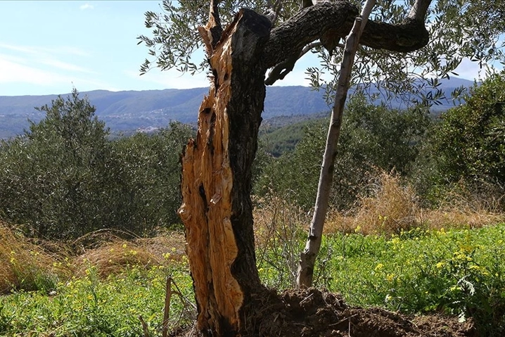 Bahçedeki yarıkla kökünden bölünen 80 yıllık zeytin ağacının iki parçası, birbirinden yaklaşık 15 metre ayrıldı.
