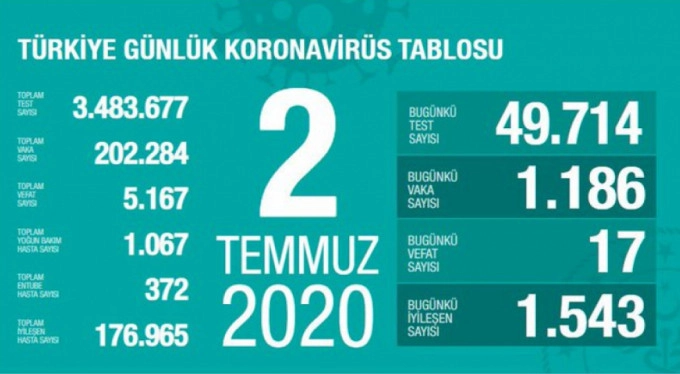 Sağlık Bakanlığının internet sitesinde yer alan ve Bakan Fahrettin Koca'nın Twitter'dan paylaştığı "Türkiye Günlük Koronavirüs Tablosu"nun güncel verilerine göre, bugün 49 bin 714 test yapıldı, 1186 kişiye Kovid-19 tanısı konuldu. Son 24 saatte 17 hasta hayatını kaybetti, 1543 kişi iyileşti.