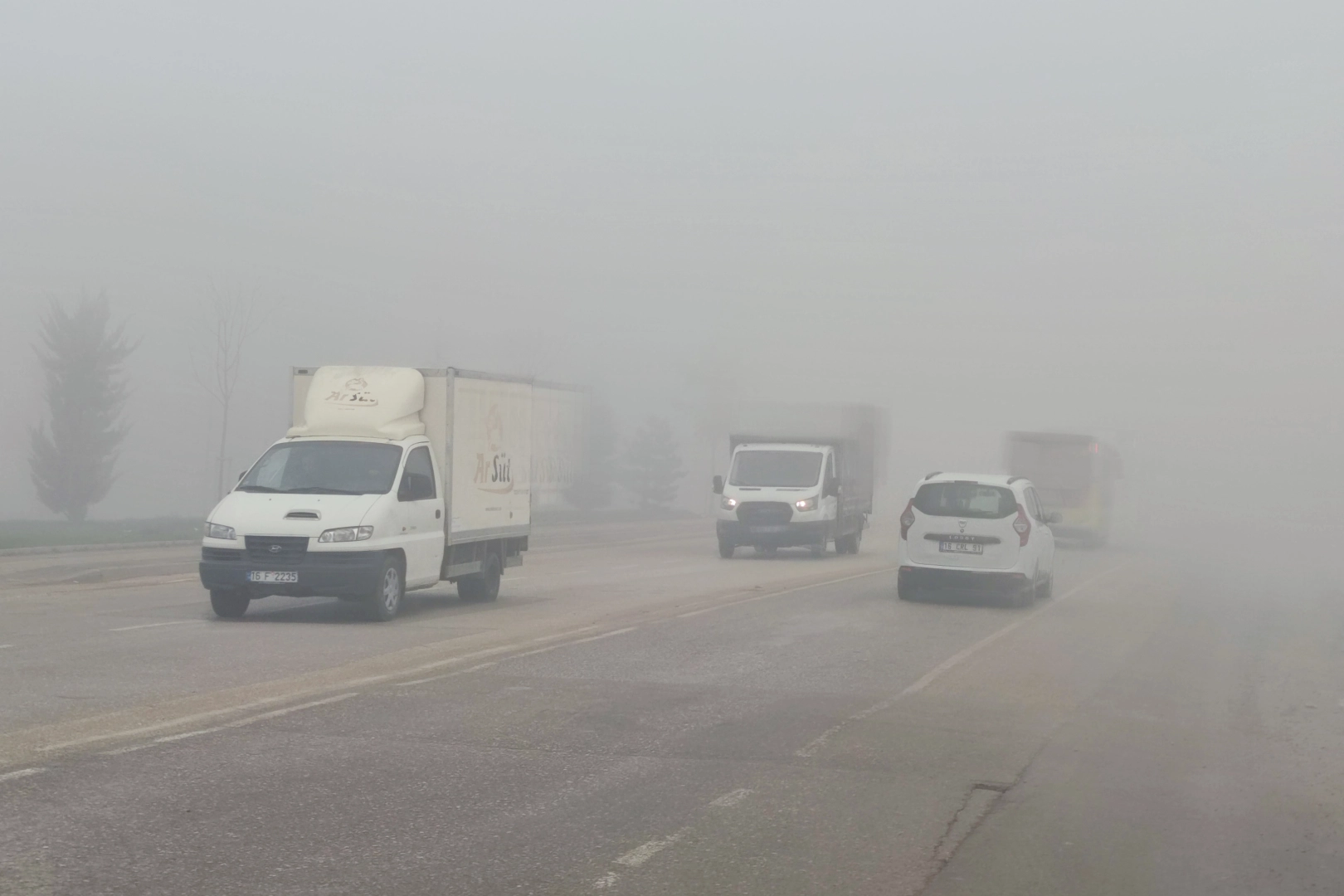 Bursa'nın İnegöl ilçesi Alanyurt, Mesudiye ve Akhisar bölgelerinde yoğun sis nedeniyle görüş mesafesi yer yer 10 metreye kadar düştü.