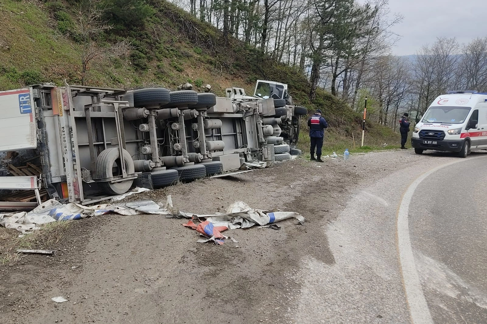 Yoldan çıkan tır yamaca devrildi.