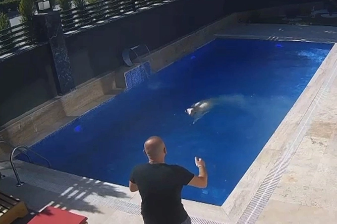 Bir villanın bahçesine giren koç, havuza atlayarak yüzmeye başladı. Havuz başında bekleyen Samet Kasap, kısa süre yüzdükten sonra havuz kenarına gelen koçu, dışarı çıkardıktan sonra kurban yerine götürerek kesim işlemini yaptı.