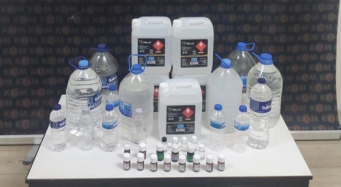 İş yerinde yapılan aramada, satışa hazır 12 litre sahte rakı, 10 litre sahte votka, 25 litre tıbbi kullanım amaçlı etil alkol ve içki imalatında kullanılan 18 anason esansı ele geçirildi.