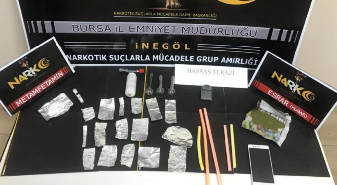 Yapılan aramada, 5,66 gram esrar ve uyuşturucu içme aparatı ele geçirildi. Daha sonra A.Ş'nin ikametinde yapılan aramada ise 2 paket halinde toplam 13 gram sentetik uyuşturucu, hassas terazi, payp olarak tabir edilen 2 cam aparat ile uyuşturucu satışı ve paketlemesinde kullanılan çeşitli araç gereç ele geçirildi.
