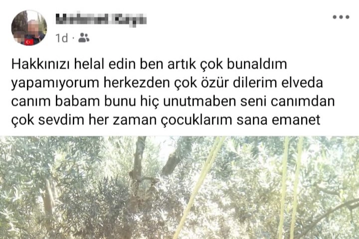 Olay, Bursa’nın Orhangazi ilçesinde meydana geldi. Orhangazi Belediyesi’nde temizlik personeli olarak çalışan 41 yaşındaki M.K.'nin sosyal medya hesabından bir paylaşımda bulunması ortalığı karıştırdı. M.K. sosyal medya hesabından boynunda bir iple paylaştığı fotoğraf ile “Hakkınızı helal edin artık çok bunaldım yapamıyorum. Herkesten çok özür dilerim. Elveda canım babam bunu hiç unutma ben seni canımdan çok sevdim her zaman. Çocuklarım sana emanet” notunu paylaştı. Ekipler harekete geçti