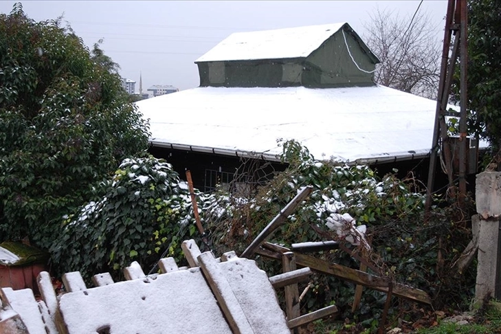 Yağışla çevredeki evlerin çatıları ve arabaların üstü karla kaplandı.