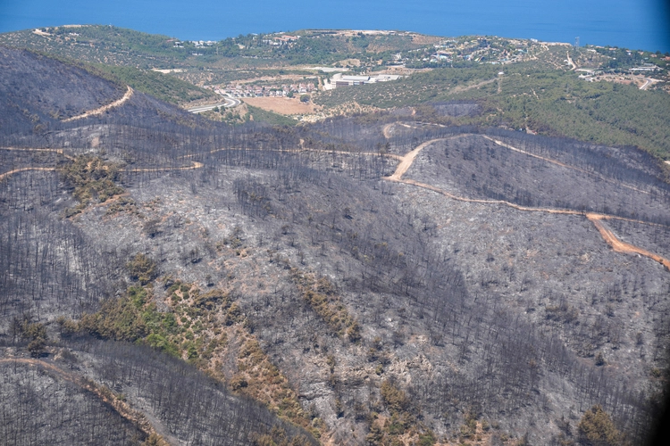 İzmir'in Selçuk ilçesinde zarar gören orman alanı helikopterden görüntülendi