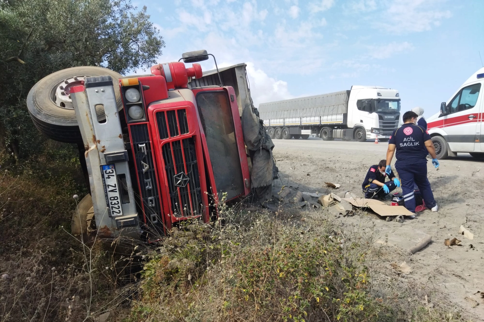 İznik'te Mehmet Nuri Çalışki (29) idaresindeki 34 ZV 8322 plakalı çimento yüklü kamyon, İznik-Yenişehir kara yolunun Derbent Mahallesi mevkisinde ağaçlık alana devrildi.