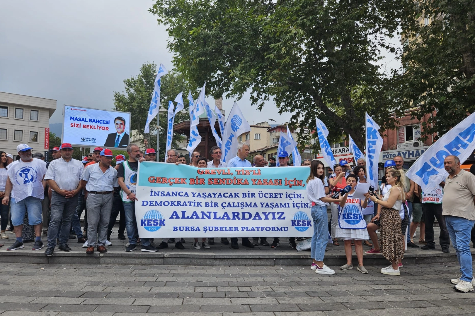 Bursa’da Şehreküstü Meydanı’nda bir araya gelen kamu emekçileri adına basın açıklamasını KESK Bursa Şubeler Platformu Sözcüsü Nuriye Aydemir okudu. Aynı zamanda 12 milyon emeklinin de hakkını savunduklarını söyleyen Aydemir, “İktidar, merkez bankasının hedeflediği, ama her zamanki gibi tutmayacağı bugünden belli olan enflasyon oranlarının bile altındaki teklifi ile hepimizle açıkça alay etmiştir. Üstelik hükümetin tırnak içinde teklifinde tüm kamu emekçilerinin ortak taleplerine ve 11 hizmet kolunun taleplerine dair tek cümle edilmemiştir” diye konuştu.
