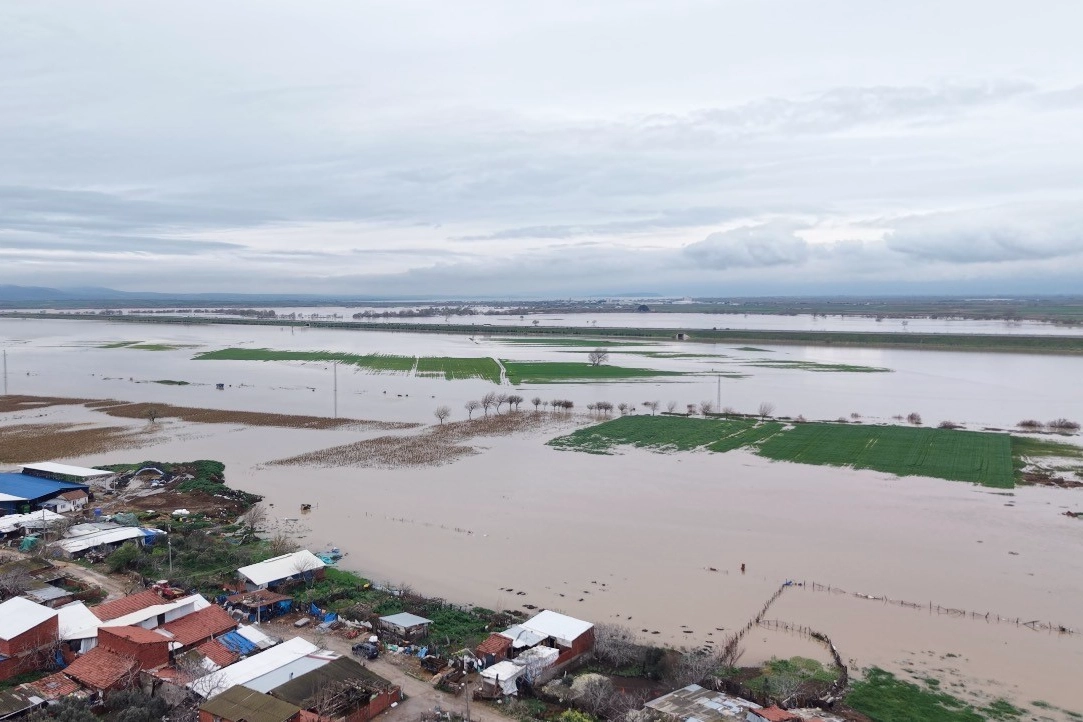 Dron ile kaydedilen görüntülerde, tarım arazilerinin büyük bölümünün suyla kaplandığı dikkat çekerken, taşkının boyutu havadan daha net şekilde ortaya kondu.