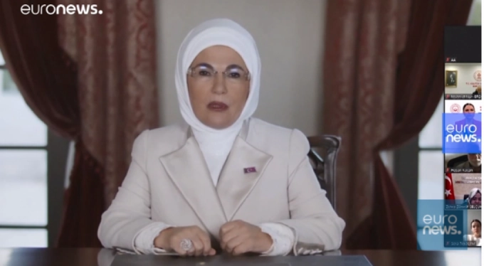 Cumhurbaşkanı ve AKP Genel Başkanı Recep Tayyip Erdoğan'ın eşi Emine Erdoğan, 25 Kasım Kadına Yönelik Şiddete Karşı Uluslararası Mücadele Günü kapsamında Aile, Çalışma ve Sosyal Hizmetler Bakanlığınca çevrim içi olarak düzenlenen "Şiddetle Mücadelede Televizyon Dizilerinin Rolü" konulu programa video mesajla katıldı.