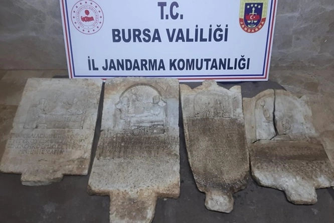 Bu kişinin iş yerinde arama yapan ekipler, üzerinde kabartma insan figürleri ve yazılar olan 4 mezar steli ile dedektör ve kırıcı delici buldu.