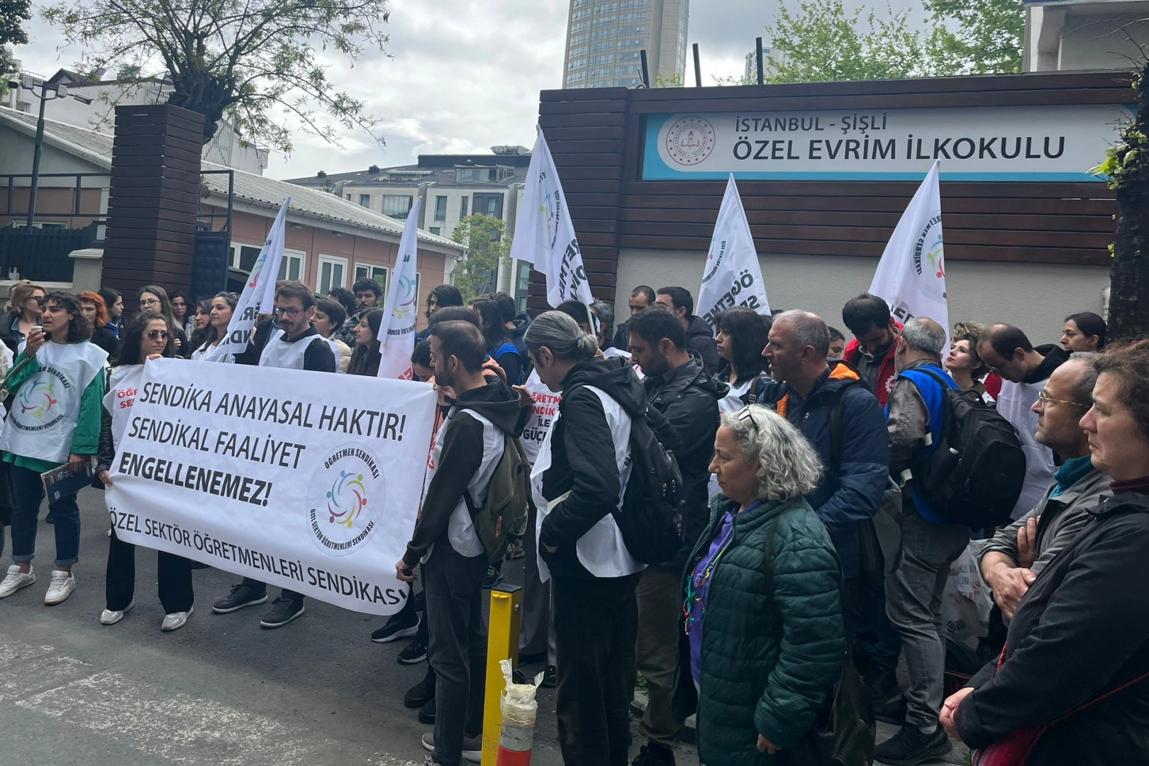 Özel Sektör Öğretmenleri Sendikası, İstanbul Şişli'de bulunan Özel Evrim Okulları'nda çalışan sendika yöneticisi iki öğretmenin işten çıkarılması okul önünde yapılan basın açıklamasıyla protesto edildi.