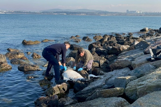 Kocaeli'nin Darıca ilçesi Bayramoğlu Mahallesi Balyoz Koyu'nda, devriye görevi yapan güvenlik güçleri, kayalıklarda ölü yunus olduğunu fark etti.