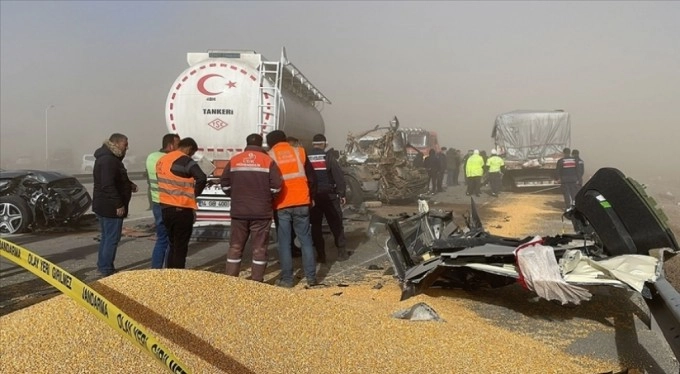 Kuvvetli rüzgarın oluşturduğu kum fırtınası nedeniyle Konya-Ankara kara yolunda Cihanbeyli ilçesine bağlı Karabağ Mahallesi'nde 2'si yakıt tankeri, 2'si kamyon, 4'ü otomobil olmak üzere 8 aracın karıştığı zincirleme trafik kazası meydana geldi.