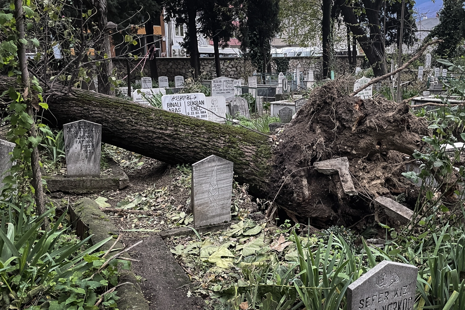 Osmangazi ilçesi Küçükbalıklı Mezarlığı'nda kuvvetli lodos nedeniyle köklerinden sökülüp kırılan ağaçlar, mezarların üzerine düştü.