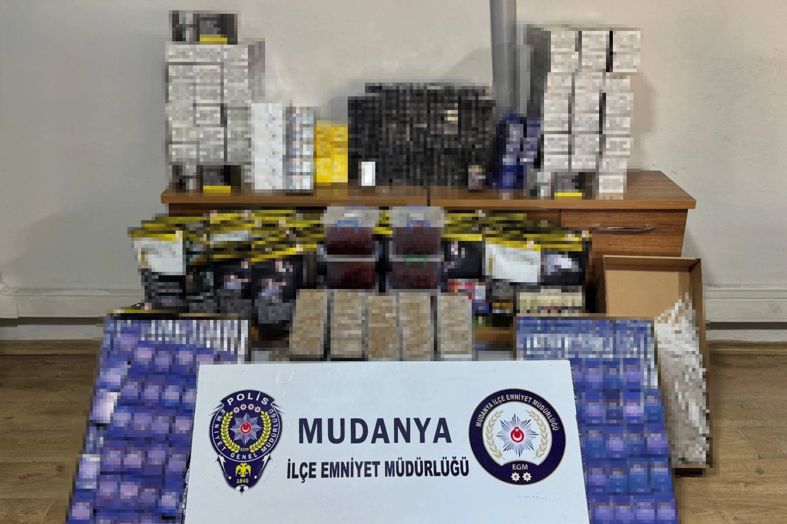 Bursa Emniyet Müdürlüğü Mudanya İlçe Emniyet Müdürlüğü ekipleri, ilçedeki bir evde kaçak tütün bulunduğu bilgisine ulaştı. Belirlenen ikamete düzenlenen operasyonda piyasa değeri 200 bin lira olduğu değerlendirilen 2 bin 250 adet boş sigara kutusu, 30 bin 360 adet (bin 518 paket) kıyılmış tütünle doldurulmuş makaron, 9 bin adet boş makaron, 6 bin gram nargile tütünü, 225 adet doldurulmuş makaron, 147 adet puro, 6 adet elektronik sigara ve 2 paket pipo tütünü ele geçirildi.
