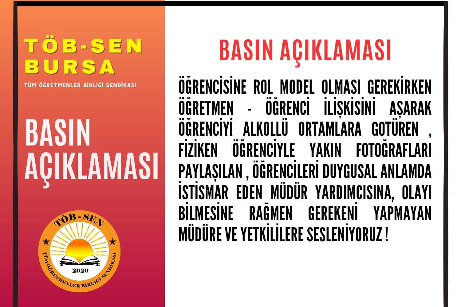 Töbsen (Tüm Öğretmenler Birliği Sendikası) tarafından paylaşılan bilgilere göre, Bursa’da bir lisede müdür yardımcısı olarak görev yapan E… isimli personelin, öğrencilerle okul dışında alkol aldığı ve onları arabasında gezdirdiği iddia edildi. Söz konusu müdür yardımcısının, öğrencilerle birlikte cafe-bar benzeri mekanlarda da alkol aldığına dair fotoğrafların sendikaya ulaştığı bildirildi.
