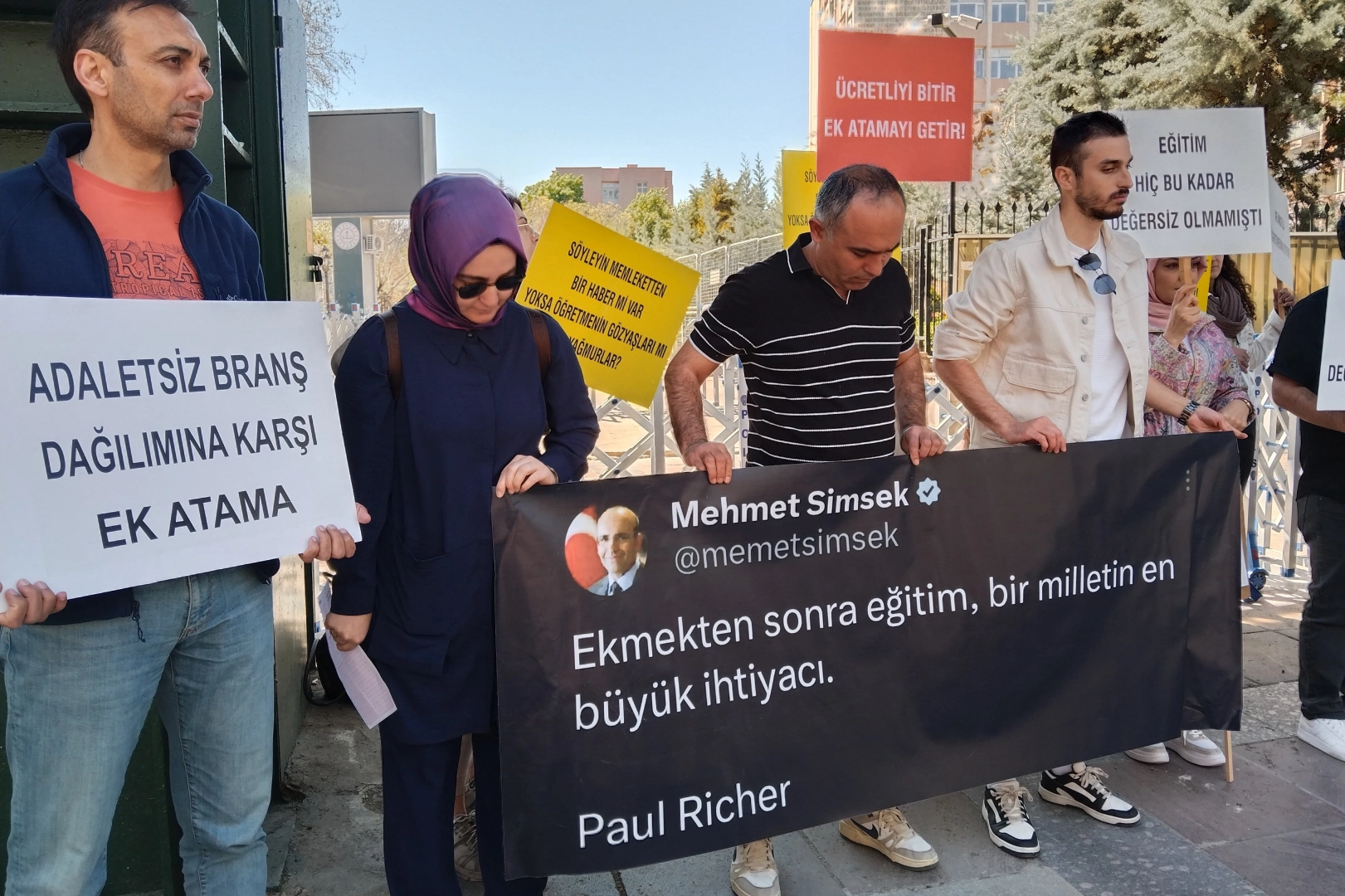 MEB önünde bir araya gelen öğretmenler, "Gün olur Yusuf kuyudadır, gün olur Yusuf kontenjanda zorbadır" ile Hazine ve Maliye Bakanı Mehmet Şimşek'in X paylaşımına atıfla "Ekmekten sonra eğitim, bir milletin en büyük ihtiyacıdır - Paul Richer" yazılı pankartlar taşıdı.