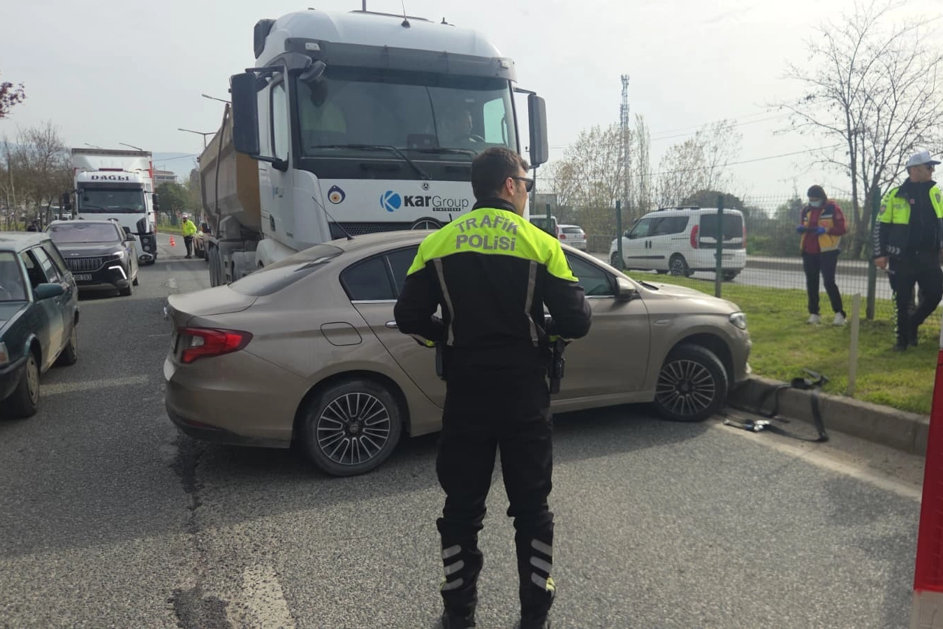 Bursa'nın Orhangazi ilçesinde saat 10.00 sıralarında Yalova-Bursa kara yolu Orhangazi Yeniköy Kavşağı yakınlarında bir kaza meydana geldi. Edinilen bilgiye göre, Yalova'dan Orhangazi istikametine doğru gitmekte olan bir hafriyat kamyonu önündeki otomobile çarptı. Kamyon, otomobili yaklaşık 50 metre sürükledikten sonra durabildi. Kazada araçta bulunan 4 kişilik aile büyük şok yaşadı. Kaza nedeniyle kara yolunda trafik tek şeritten sağlandı. Polis ekiplerinin kazayla alakalı tahkikatı devam ediyor.