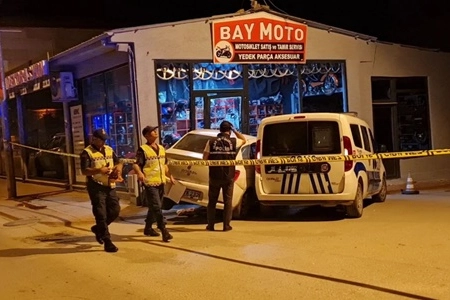 Çarpışmanın etkisiyle savrulan otomobil, motosiklet bayisinin vitrin camını kırıp içeri girerek durabildi.